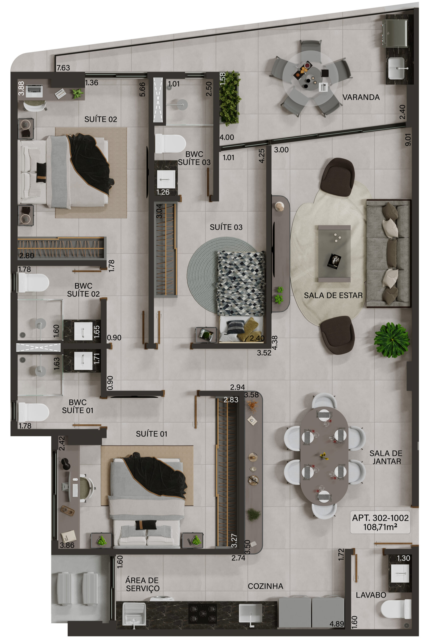 Apartamento 301 a 1001: 3 Quartos 106,58m²